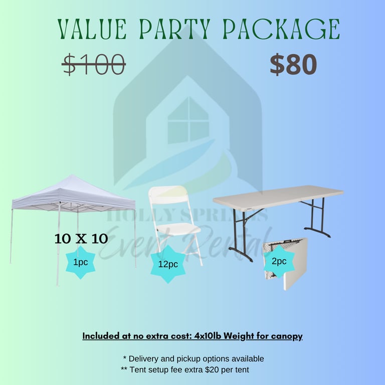 Includes: 4 Canopies, 48 Chairs, 8 Tables, 32 Weights