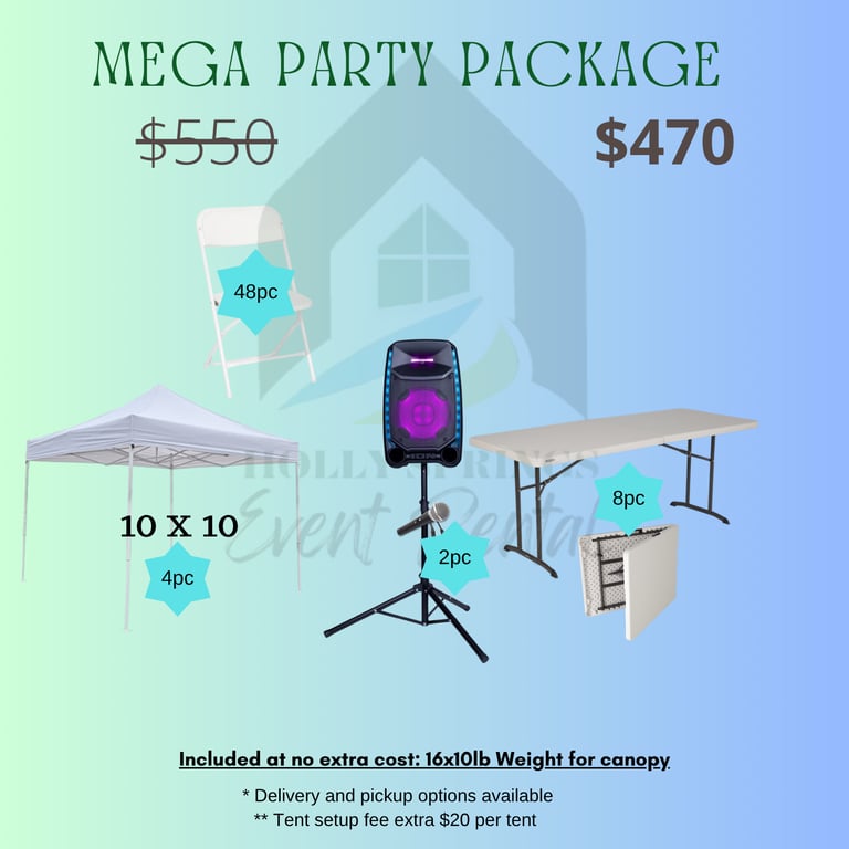 Includes: 4 Canopies, 48 Chairs, 8 Tables, 32 Weights, Speaker + Mic + Tripod